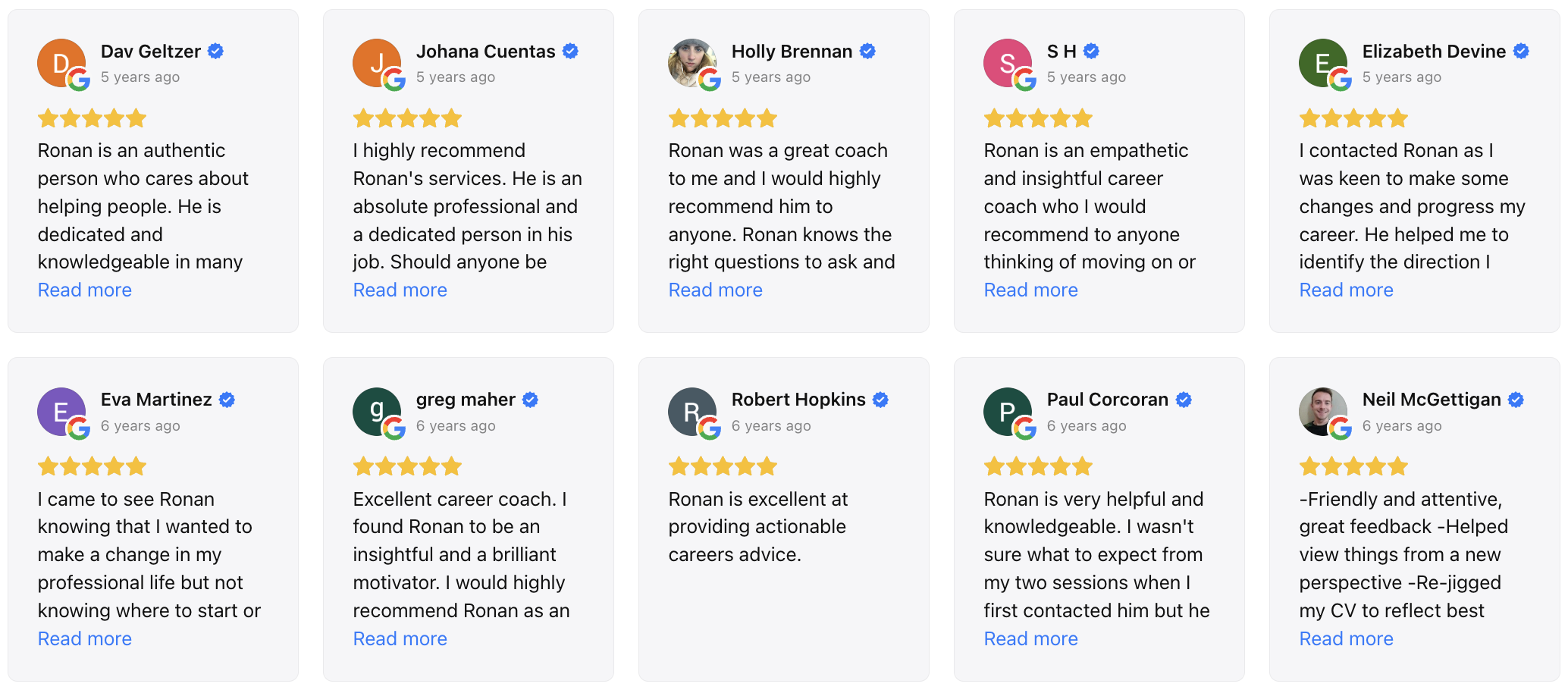 "Ronan is an amazing Career Coach! He is the best in his field. Full of fresh ideas, kind and genuinely invested in your success."